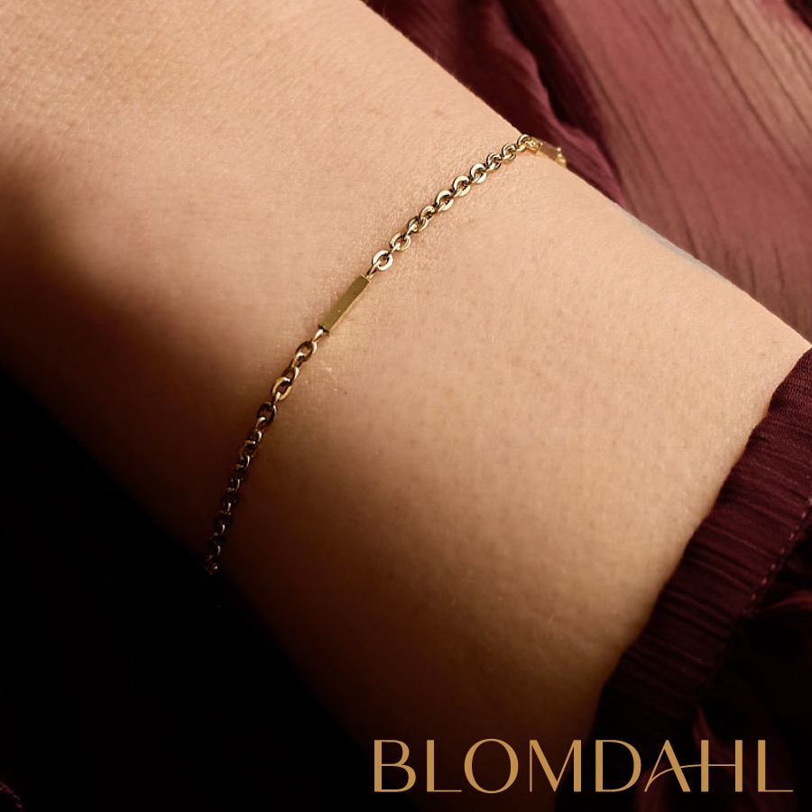 アレルギー対応ブレスレット(アレルギーフリーブレスレット)。チェーンとペンダントを肌に優しいセラッミクコーティングで金色にコーティングしました。皮膚科専門医と協議して開発したコーティングです。材料はステンレス鋼(スチール)316Lで、これは高品質の外科用鋼としても知られており、医療目的で使用されています。肌に優しい装飾コーティングは、コーティングを施していない同じ部品と比較してニッケル漏れが300倍低減されます。